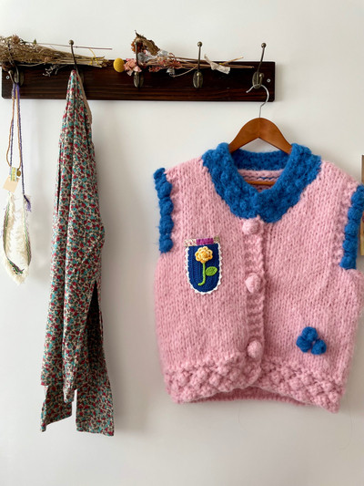 꽃정원 핑크 핸드니팅 데일리 조끼 러블리 손뜨개 가디건주의 데일리 실크,핸드 스티치 로브