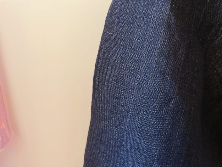 🏷️ 원단 패턴특성: 진한 네이비바탕에 얇은 브라운톤의 스트라이프, 기시감이 있음